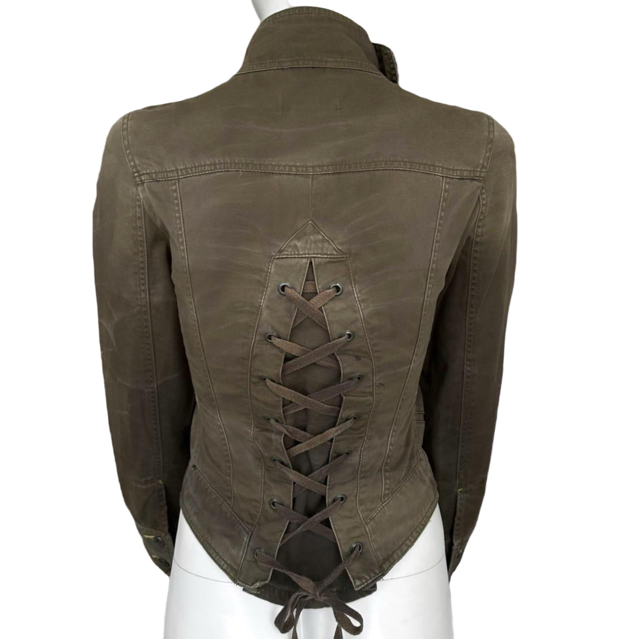 This corset jacket blends edgy structure with feminine detail for a bold, sculpted silhouette. Crafted from durable washed cotton with a subtle distressed finish, it features a high-button front, form-fitting seams, and a lace-up back that cinches perfectly to accentuate your waist. The tailored cut and military-inspired collar bring a confident, elevated look—ideal for layering over tanks, dresses, or fitted tops.