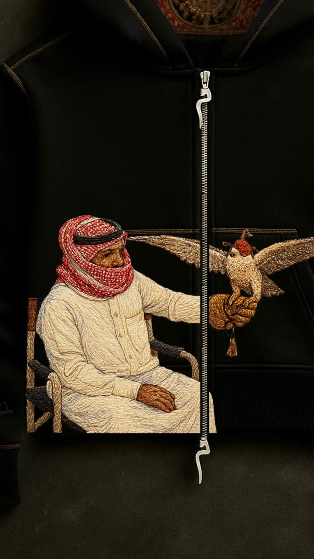 Step into a blend of tradition and modern streetwear with this premium embroidered hoodie. Crafted from heavyweight cotton, this piece features an intricate front embroidery depicting a falconer with his bird — a striking nod to heritage and artistry. The hood is lined with a Persian rug–inspired motif, adding a hidden layer of luxury, while custom stitching and a unique zipper pull elevate the design even further.