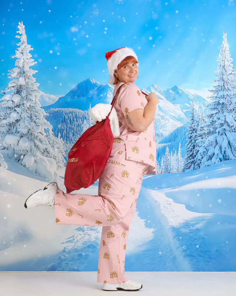 Bring holiday cheer to every shift with this adorable gingerbread-print scrub set. Designed for comfort and functionality, these scrubs feature a soft, breathable fabric that keeps you feeling good through long hours on your feet. The relaxed fit allows easy movement, while multiple pockets give you plenty of space for essentials. Finished with a playful mix of gingerbread characters, candy canes, and gingerbread houses, this set adds a fun festive touch to your workday while still looking polished and professional. Perfect for healthcare pros who love adding personality to their uniform.